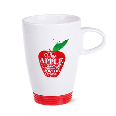 Porcelanowy, biały kubek reklamowy z silikonową nakładką dostępną w wielu wersjach kolorystycznych: żółty, pomarańczowy, czerwony, zielony, niebieski, czarny Produkt jest końcówką serii, mogą na nim występować nakłucia, kropki oraz różnice w odcieniu szkliwa.