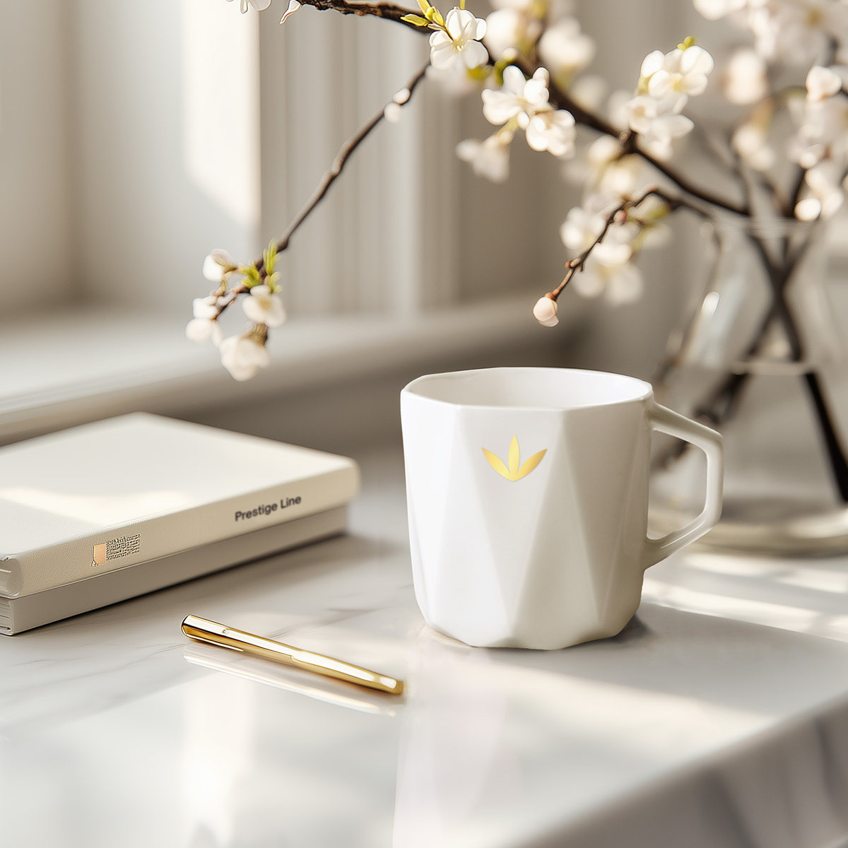 Prestiżowy kubek wykonany z najwyższej klasy porcelany Fine Bone China. Wyróżnia go wyjątkowy geometryczny kształt swą strukturą przypominający diament. Reprezentant linii Prestige Line.