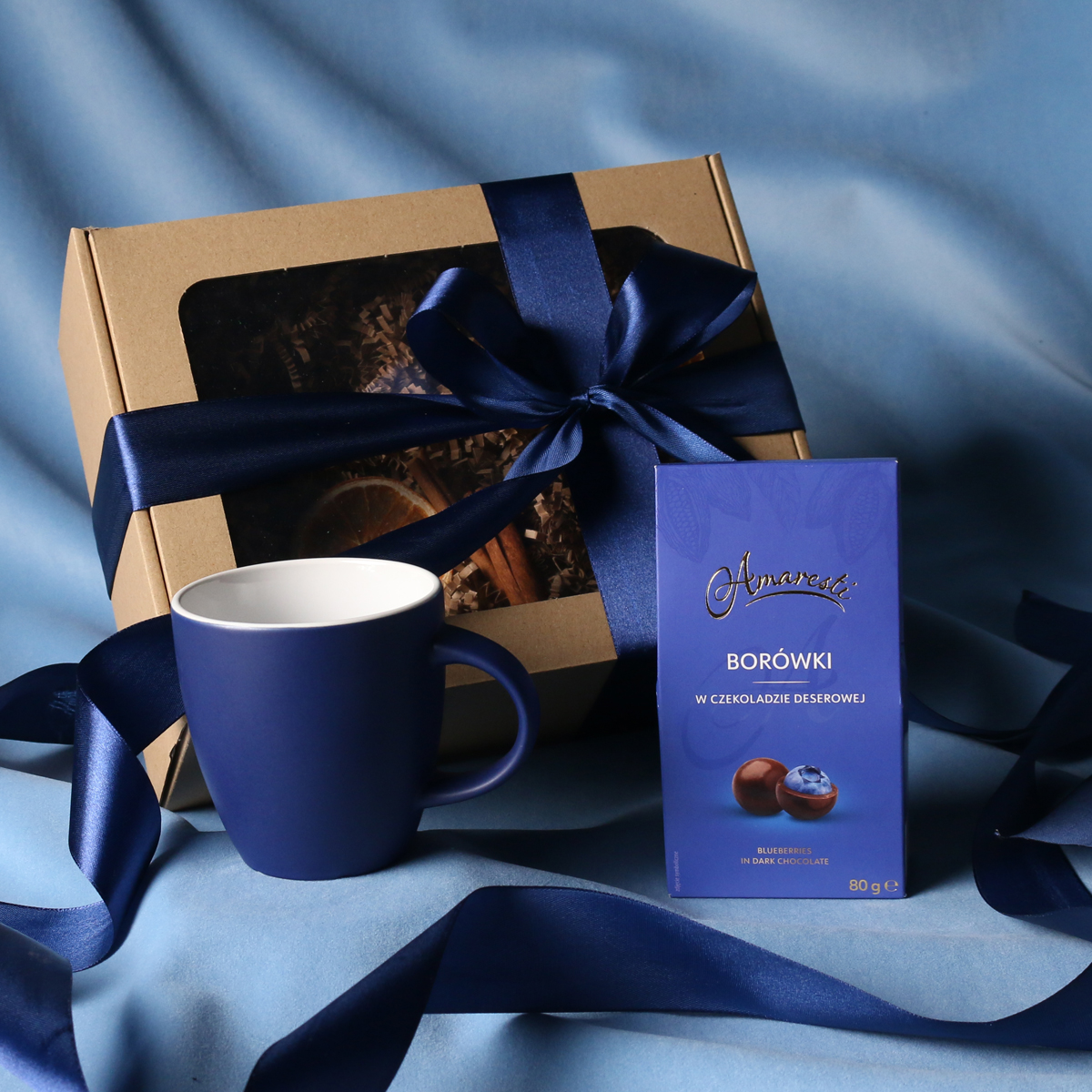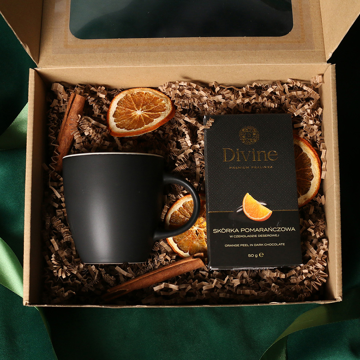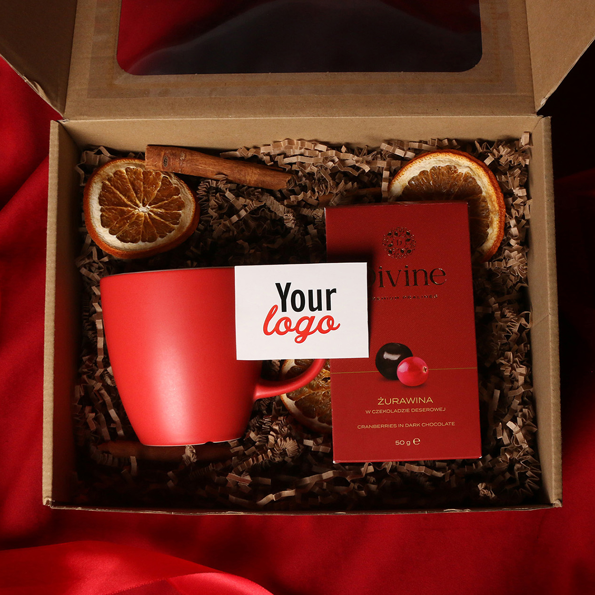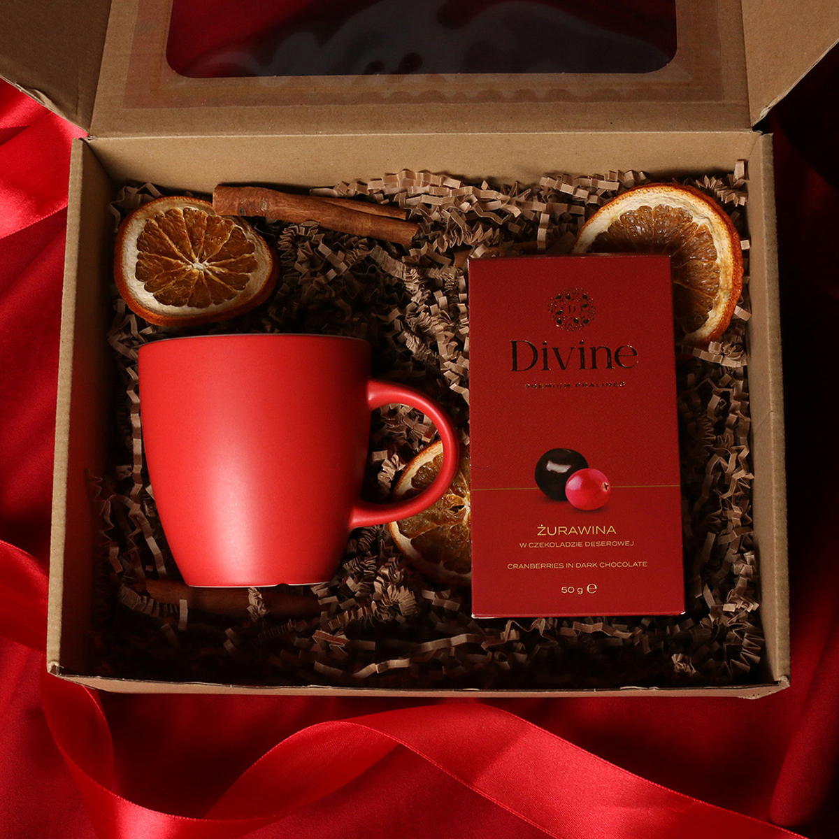 W skład zestawu wchodzą: kubek Fiord czerwono-biały / granatowy-biały / czarny-biały z możliwością zdobienia,  Divine Pralines - żurawina w czekoladzie (czerwony) / borówki w czekoladzie (granatowy) / skórka pomarańczy w czekoladzie (czarny) Całość w stylowym opakowaniu z tektury eco z okienkiem.  Opcje dodatkowej customizacji:  nadruk na kubku, bilecik z logo firmy, wstążka lub obwoluta  z motywem zimowym wzbogacona złoceniem