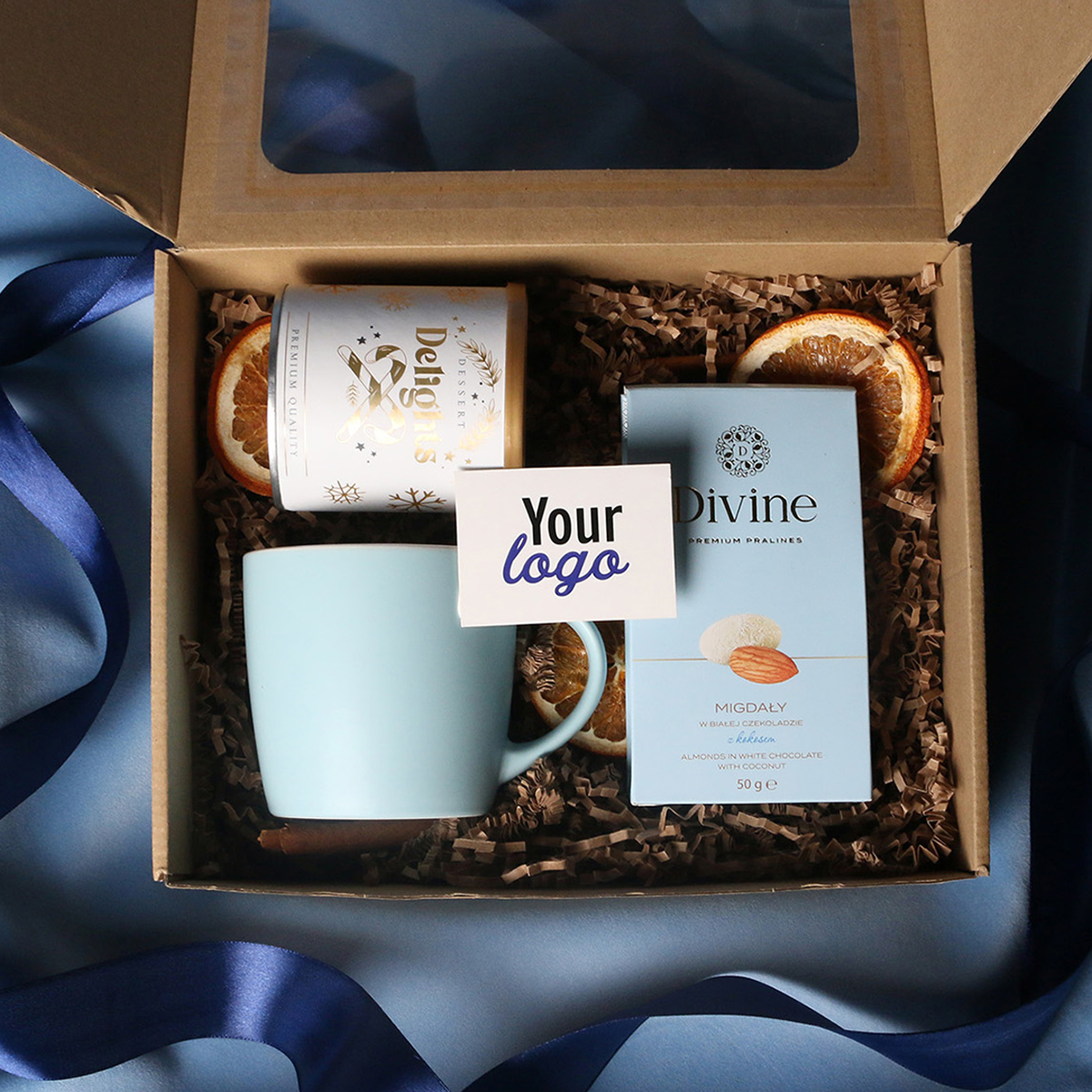 W skład zestawu wchodzą: kubek Handy Velvet rose pink-biały / baby blue-biały / Handy Cool szary-biały z możliwością zdobienia, Divine Pralines - migdały w czekoladzie z malinowym pudrem (różowy) / migdały w czekoladzie z kokosem (niebieski), skórka pomarańczy w czekoladzie deserowej (szary) Dessert Delights - Czarna porzeczka w białej czekoladzie z pudrem malinowym zapakowana w tubę z motywem zimowym. Całość w stylowym opakowaniu z tektury eco z okienkiem. Opcje dodatkowej customizacji: nadruk na kubku, bilecik z logo firmy, wstążka lub obwoluta z motywem zimowym wzbogacona złoceniem.